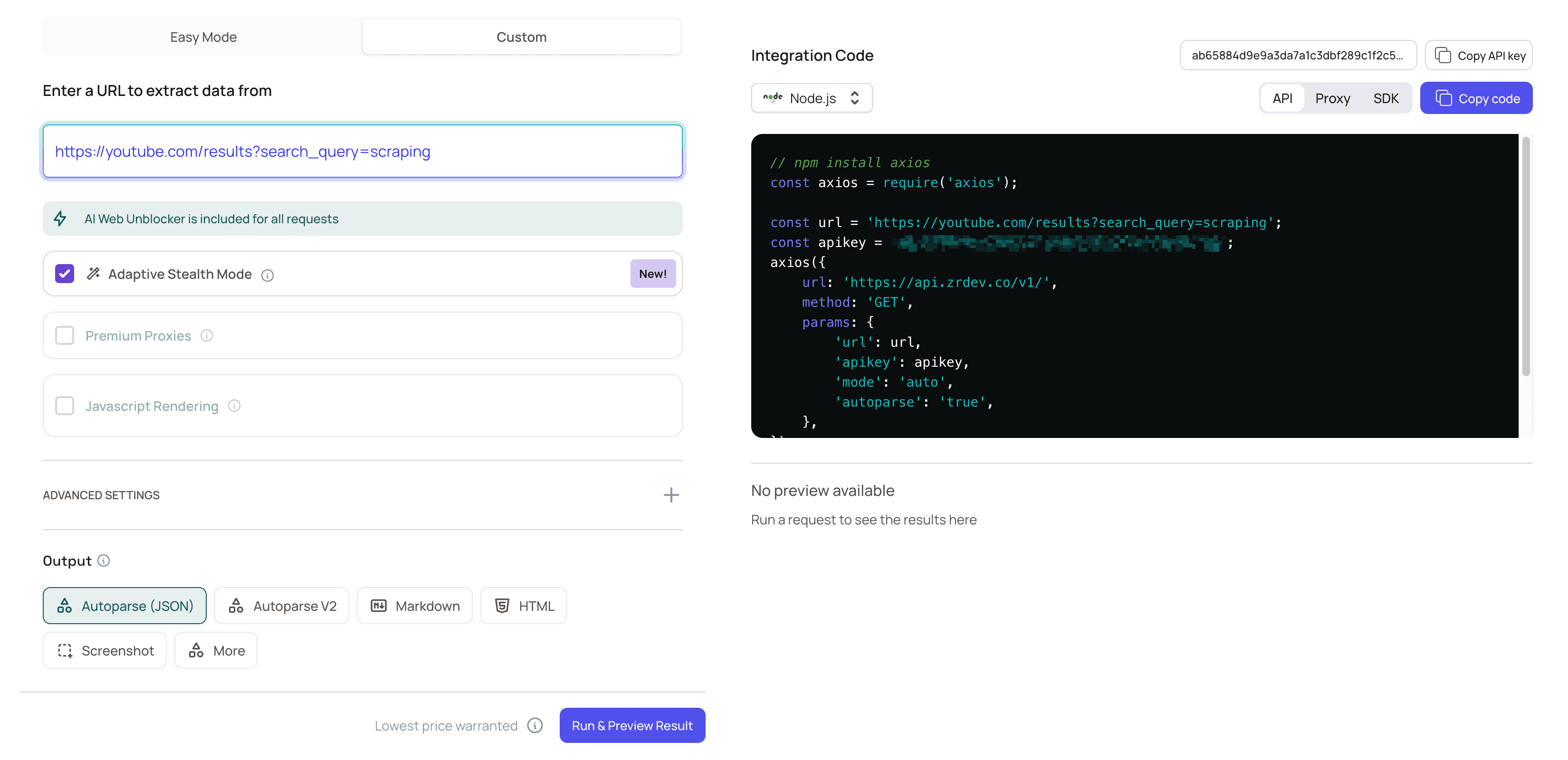 The simplest way to scrape complex or protected sites in code is to use Adaptive Stealth Mode (mode=auto). ZenRows analyzes each request and automatically applies the right combination of JavaScript rendering and Premium Proxies only when needed, so you get reliable results without having to tune parameters yourself. Add mode=auto to your request: