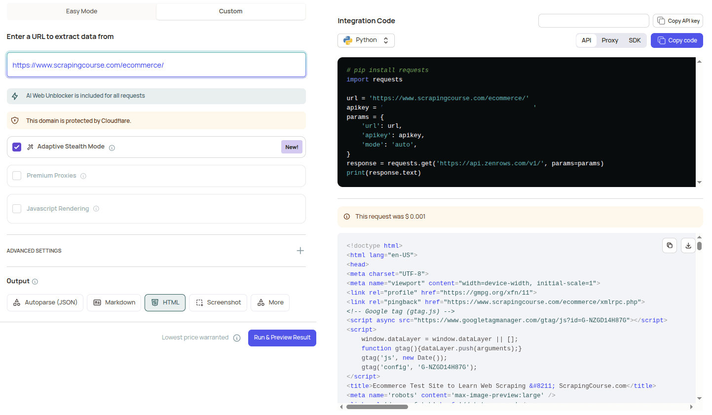 For fine-grained control when you know exactly which features a site needs, use the Request Playground’s custom mode to set parameters yourself. You can manually configure JavaScript rendering, Premium Proxies, and other options, or select Adaptive Stealth Mode (mode=auto) to let ZenRows choose automatically.